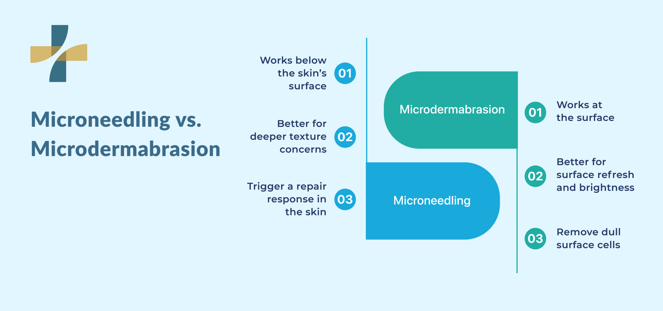The main difference between microneedling and microdermabrasion is treatment depth. Microneedling works below the surface by creating controlled micro-injuries that support collagen production. Microdermabrasion works on the outer layer of skin through exfoliation and surface smoothing. That makes microneedling more suitable for deeper texture concerns, while microdermabrasion is often better for quick refresh goals.